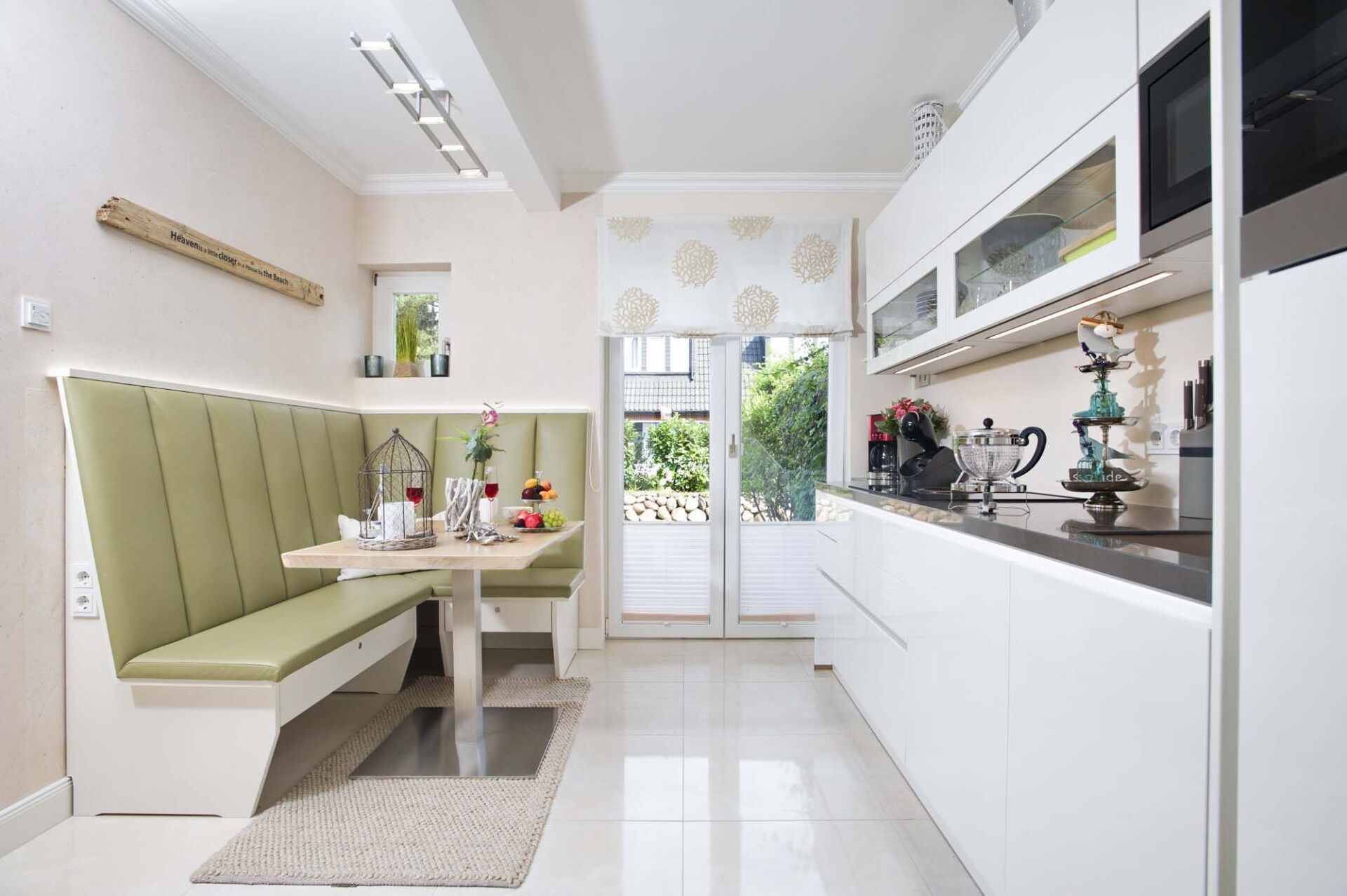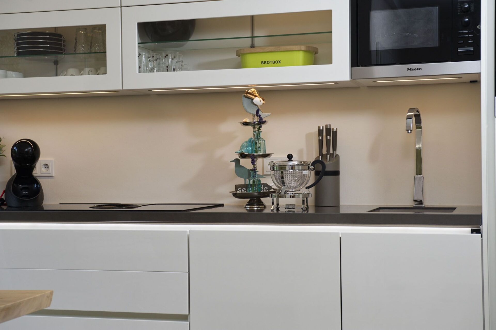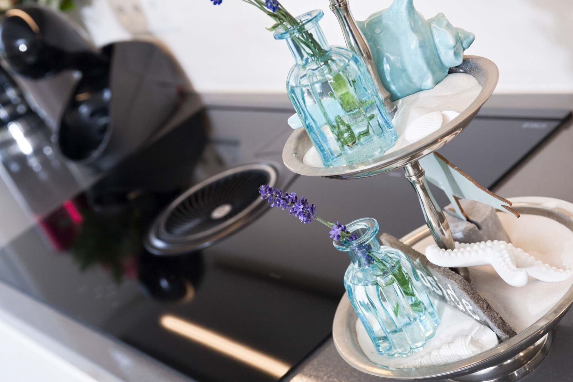 Angrenzend an das Wohnzimmer findet sich die teiloffene, sehr großzügige und helle Wohnküche inklusive bequemen Essbereich. Die Elektrogeräte sind ausschließlich von Miele sowie auch der vorhandene Induktionsherd mit integriertem Bora Dunstabzugssystem, der perfekte Voraussetzungen für einen gemütlichen Kochabend schafft. Eine Mikrowelle, ein großer Kühlschrank u. v. m. gehören selbstverständlich auch zur Ausstattung der modernen Küche. Für den Morgenkaffee stehen den Urlaubern eine Kapselmaschine sowie eine Filterkaffeemaschine zur Verfügung. In der Küche befinden sich außerdem hochwertiges Geschirr, Gläser und Besteck sowie viele weitere Küchenutensilien, die ebenfalls zum gemeinsamen Kochen einladen. Von der Küche aus gelangen Sie auf die Frühstücksterrasse - eine der drei Terrassen des Hauses -, die schon am frühen Morgen Sonne bietet. Sie ist mit einem Strandkorb, Sonnenschirm und Gartenmöbeln ausgestattet.