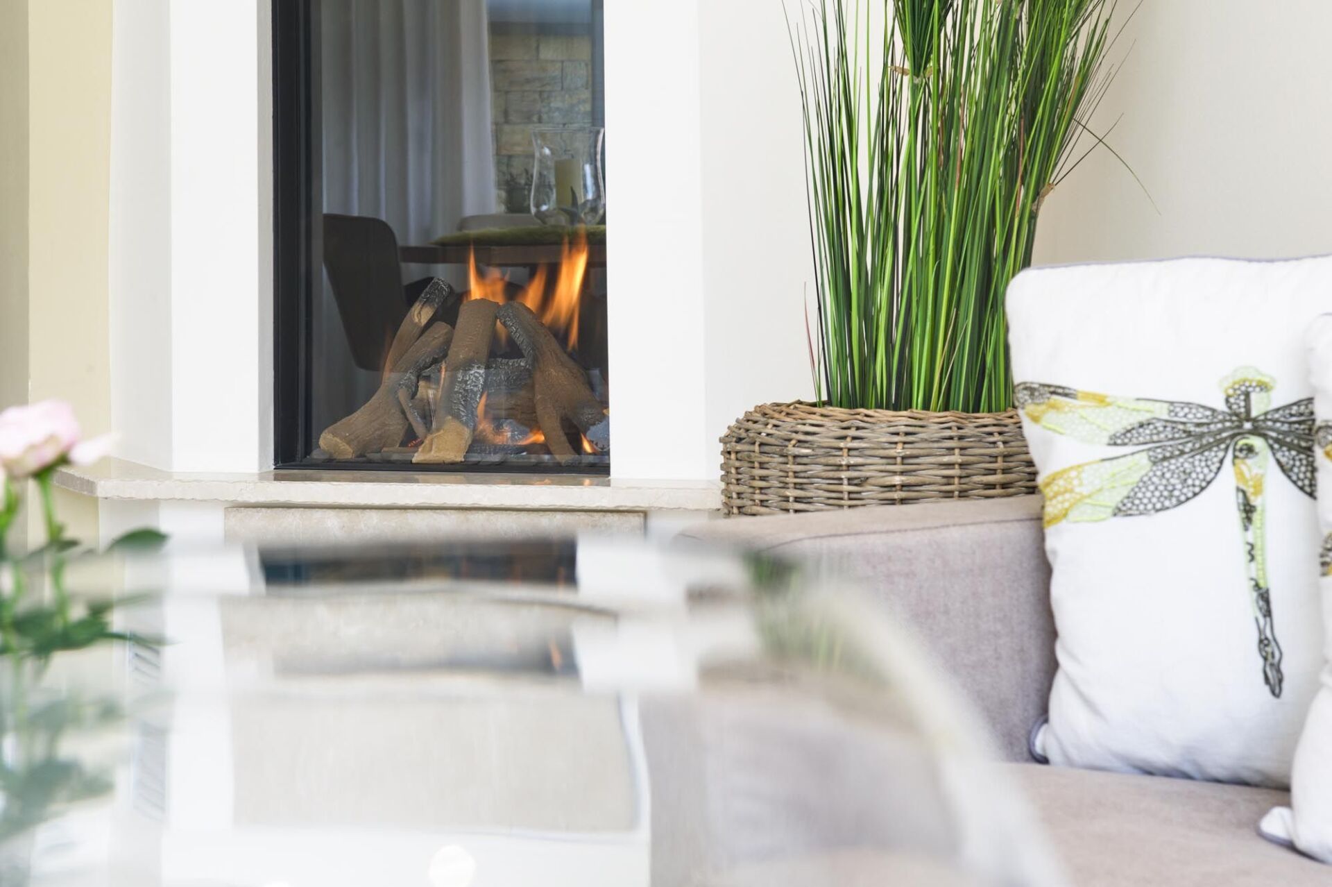 Das Wohnzimmer ist hochwertig eingerichtet und verfügt über einen Gaskamin sowie selbst entworfene und hergestellte, exklusive Möbel. Eine geräumige Eckcouch lädt zum Entspannen ein, während sich an dem großen Esstisch die ganze Familie zum Essen versammeln kann. Die zwei Panoramafenster erfüllen den Raum mit Licht und erzeugen so ein helles und freundliches Ambiente. Außerdem ist das Wohnzimmer mit einem Sonos-System und Flachbildfernseher ausgestattet. Ein großes Schiebeelement verbindet das Wohnzimmer mit einer überdachten Außenterrasse. So ist ein tolles Ambiente mit gleichzeitigem innen und außen Wohnen möglich.